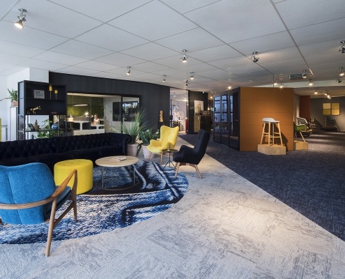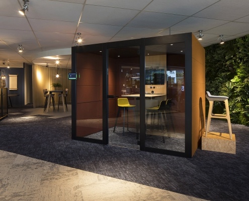 In een showroom is het lastig om voor iedere klant de juiste producten in de juiste kleur te laten zien. Daarom hebben wij gekozen voor een sfeerbeleving waarin we de verschillende functionaliteiten van werkplekken en vergaderruimtes terug laten komen.
